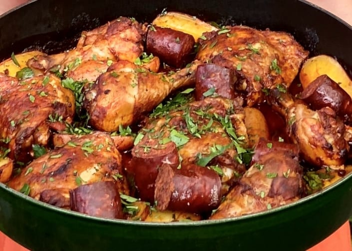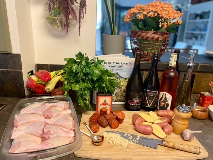 All hail one dish meals! What is old is new again and one dish/sheet pan meals are all the rage. What can be better than a one dish meal where flavours can meld together while cooking and get super browned by the wide exposure of a shallow roasting pan. This recipe from CedarCreek Winery winemaker Taylor Whelan features Portuguese flavours and gives chicken a gorgeous red colour by using smoked Paprika. Paired with a BC Sauvignon Blanc, this dish is perfect for September to celebrate harvest time in wine country. Enjoy and cheers to our local chicken farmers and local winemakers!